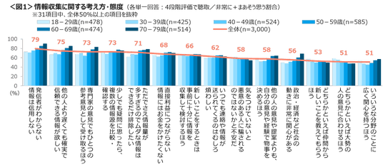 情報収集についての考え方・態度を4段階で聴取した。非常に+まあそう思う割合は、「発信者がわからない情報は信用しない」「他の人より遅くても確実で信頼できる情報が欲しい」がTOP2で年代が上がるほど割合は増える。続く7割台は、「専門家の意見でもひとつの参考意見として受け取る」「少しでも疑問に思ったら、複数の情報源を比較・確認する」「ただでさえ情報量が多すぎるのでムダな情報はできるだけ排除したい」。<図1>