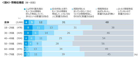 情報伝播度は、「まったく情報発信はしていないので影響力はない」が48%。伝播力について「多くの人への影響力がある」「いろいろな人に影響力がある」「それなりに影響力はある」と回答した人は18~29歳、30代で3割前後を占めた。<図4>