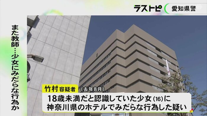 栃木県立盲学校高等部の教師・竹村修一容疑者(55)は去年8月、18歳未満だと認識していた当時16歳の少女に、神奈川県のホテルでみだらな行為をした疑いで愛知県警に逮捕されました。