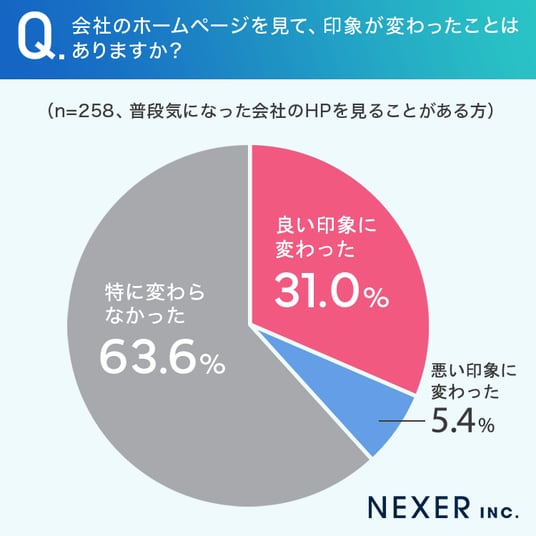 ホームページを見たとき、31%の方が「良い印象に変わった」と回答し、5.4%の方が「悪い印象に変わった」と回答しています。