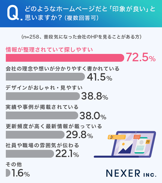 ■72.5%が、「情報が整理されていて探しやすいホームページが好印象」と回答