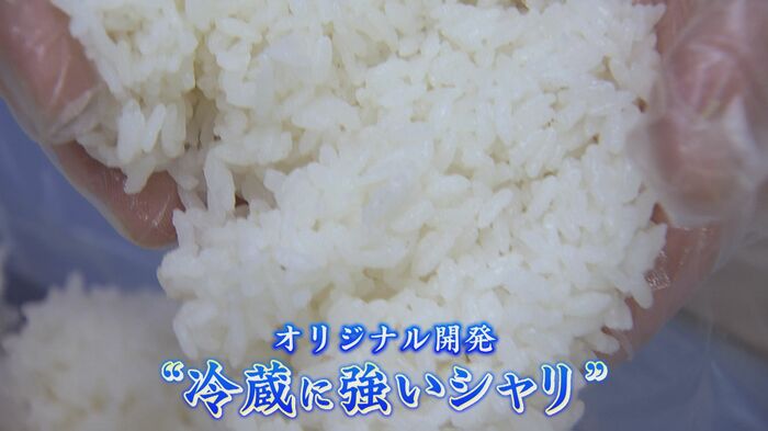 一般的に寿司で使われるシャリは、冷蔵されると固まりがちになる。しかし、元々、寿司のデコレーションケーキを商品にしていた『しめ寿し』では、その際に開発したシャリを自販機の寿司にも応用。美味しさの秘密は、冷蔵しても柔らかいシャリにあるのだ。