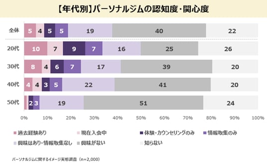 その一方で、50代では「興味がない」と答えた人が51%と半数を超え、他の年代に比べ関心が低い層となっています。実際に通っている人もごくわずかです。