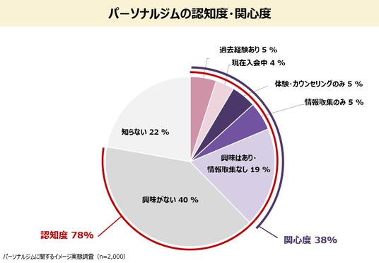 パーソナルジムに対する関心度(認知・関心・行動)を調査したところ、「パーソナルジムを知っている」と答えた人は全体の78%にのぼりました。街でパーソナルジムの看板を目にしたり、SNSの投稿に触れたりすることで、認知度が着実に高まっていることがわかります。
