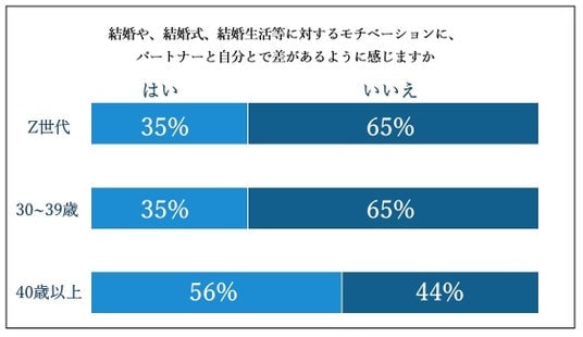 『結婚や結婚式等に対するモチベーション(式場の探し方や新居の決定方法など、結婚生活のすべてを含む)に、パートナーと自分とで差があるように感じますか』という質問に、Z世代の方の65%が「いいえ」と回答し、30~39歳の方についても同様の結果でした。一方、40歳以上の方は56%が「はい」と回答し、30代以下の方と比べてモチベーションに差があると感じている比率が高いことが分かります。
