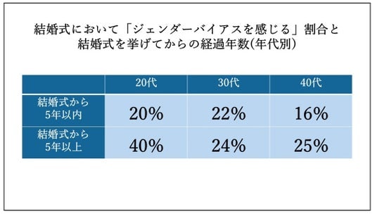 結婚式において「ジェンダーバイアスを感じる」割合と結婚式を挙げてからの経過年数(年代別)
