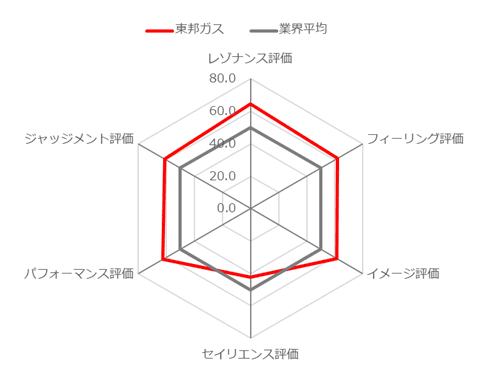 レゾナンス評価が高かった東邦ガスについて、ブランド価値を形成している要因を探るために、ピラミッドを構成する6つのブロックごとの評価を分析しました。その結果、5指標で業界平均よりも高く、特に信頼性や商品性などを表す「パフォーマンス評価」が非常に高くなりました。一方でブランドの認知やブランドに対する認識の強さを表す「セイリエンス評価」については業界平均を下回りました。