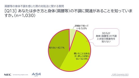 「詳細まで知っている」人は5%、つまり95%の人が歩き方と身体(肩腰等)の不調の関連性について知らないという結果になりました。