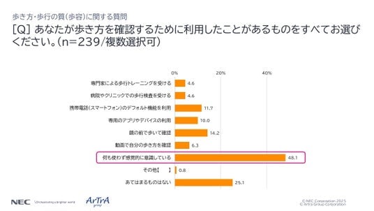 また「歩き方を意識し、行動している」と回答した人(n=239/複数選択可)が歩き方を確認するために利用しているものについて質問したところ「何も使わず感覚的に意識している」(48.1%)が最も多い回答でした。