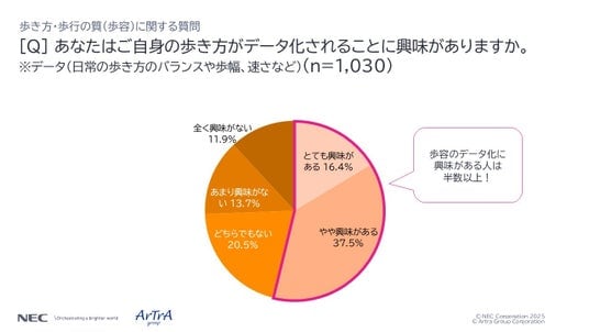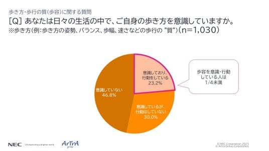 「腰楽さん」は、NECが開発したセンサやインソール、アプリを用いて、歩幅、足上げ高さ、足の接地/離地角度など多様なパラメータで日常的な歩行の様子をデータとして見える化するシステムです。これにより、普段は無意識に行っている歩行も、その質を客観的データとして専門家に見てもらうことで健康維持・改善のヒントにすることができます。今回、「歩行、身体の不調、それらの関連性」について、一般的にどのような意識を持たれているのか調査を行いました。