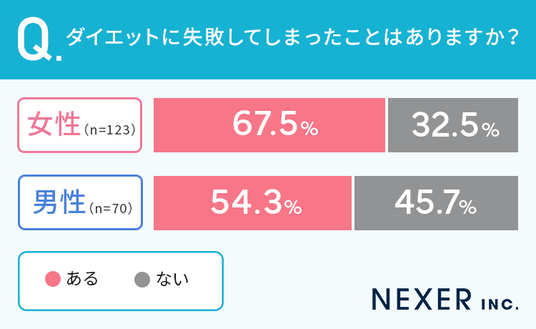 女性の67.5%の方・男性の54.3%の方が「ダイエットに失敗したことがある」と回答しました。