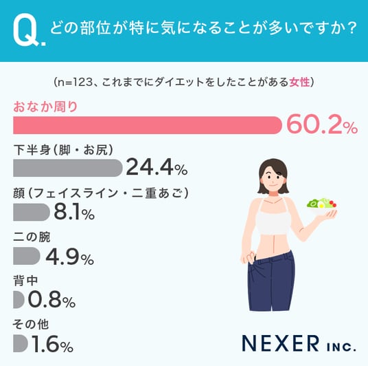 女性のうち60.2%の方が「おなか周り」、24.4%の方が「下半身(脚・お尻)」と回答しました。