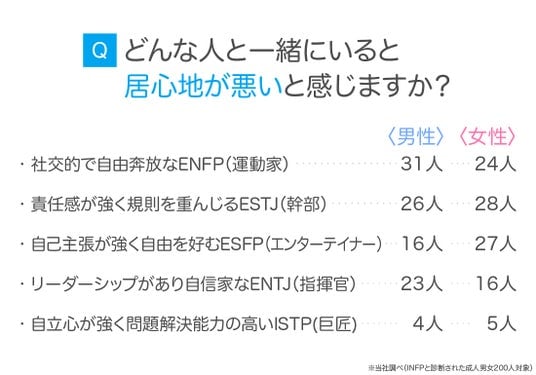 INFP(仲介者)と診断された成人男女200人に、どんな人と一緒にいると居心地が悪いか尋ねてみました。