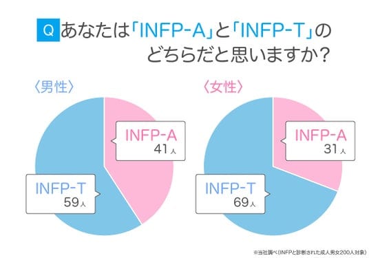 INFP(仲介者)の成人男女200人に、自分はどちらのタイプだと思うか尋ねてみたところ、「INFP-A」よりも「INFP-T」のほうが多いことがわかりました。