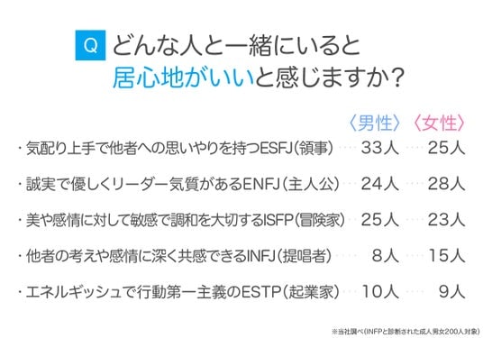 アンケート結果を見ると、「ESFJ(領事)」「ENFJ(主人公)」「ISFP(冒険家)」との相性がよさそうです。