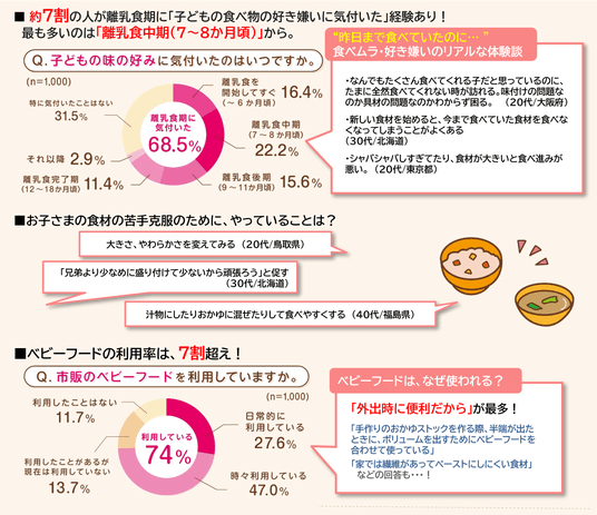 調査の結果、約7割のママ・パパが離乳食期に「子どもの好き嫌いや味の好みに気づいた経験がある」ことが明らかになりました。「昨日まで食べていたのに食べなくなる」「食材の大きさで口にしない」といった声も多く、食事への悩みがうかがえます。一方で、ベビーフードの利用率は7割超。外出時の携帯用をはじめ、「手作りに組み合わせて使う」「調理しにくい食材を補う」など、多様な場面で活用されている実態がわかりました。