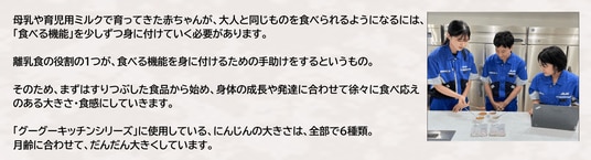 さらに、和光堂が大切にしている「安全・安心」へのこだわりや、赤ちゃんの発達段階に応じた「赤ちゃん設計」の考え方も紹介。ベビーフードの一口の大きさややわらかさ、噛む力まで丁寧に配慮した商品づくりの背景を知ることができます。