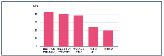 「期待した効果が得られない」43%、「医師やスタッフの対応が悪い」40.7%、「ダウンタイムが長い」38.4%が主なトラブル・不満に挙げられました。自由回答では「説明不足」「料金が高い」といった声もあり、女性は効果や説明不足に対する不満、男性は費用に関する不満が目立ち、トラブルの中心は効果・対応・費用に集中していることが明らかになりました。