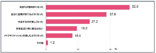 - 美容施術を受けた多くの利用者が「気持ちが前向きになった」「自分に自信が持てるようになった」など、心理面、生活面にポジティブな変化を感じている