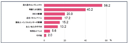 利用・検討のきっかけは「見た目のコンプレックス」56.2%、「年齢による変化」40.2%が大きな要因で、「SNSの影響」20%、「広告・キャンペーン」17.2%と続きます。若年層、特に20代男性ではSNSやインフルエンサーの影響が大きく、40代以降では加齢に伴う肌変化が動機になる傾向があります。
