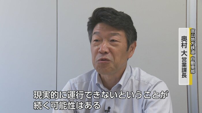 富山地方鉄道は今回の路線廃止後も運転手が13人不足している状況だ。同社自動車部の奥村大営業課長は「利用者の多いところはなるべく維持していきたいが、労働力が不足していくと現実的に運行できないということが続く可能性がある」と説明。「代替措置がある路線や利用者が少ない路線をやむなく廃止にせざるを得ない場合がある」と今後の見通しを示した。