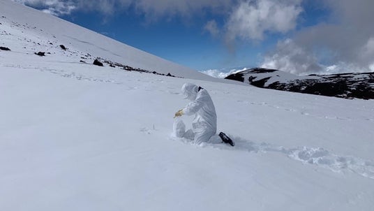 図2:マウナケア山頂部でのサンプリングの様子 コンタミネーション防止のため白衣を着用し、無菌的手法で採取