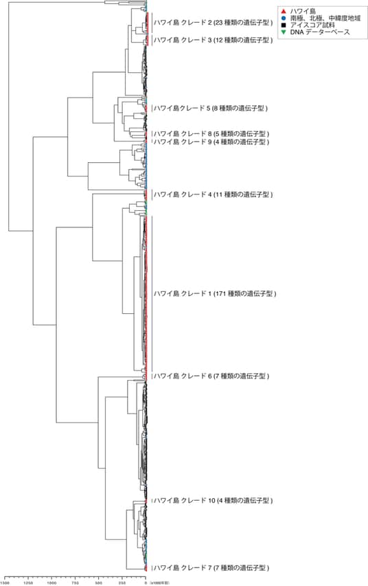 図4:ハワイ島固有系統を含むクロロモナディニア雪氷藻類の進化系統樹 ITS2を用いた解析により、ハワイ島で発見された雪氷藻類(赤点)と世界各地の同グループ藻類がどの時期に共通祖先から分岐したかを推定。数値は分岐年代(年前)を示す。比較対象は南極・北極・中緯度地域の雪氷、中央アジアの氷河コア、および世界の遺伝子データベースから得られた同グループの藻類。