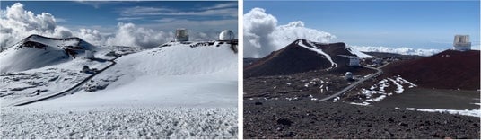 図1:マウナケア山における積雪の写真 左図:2021年1月21日、右図:2021年3月26日