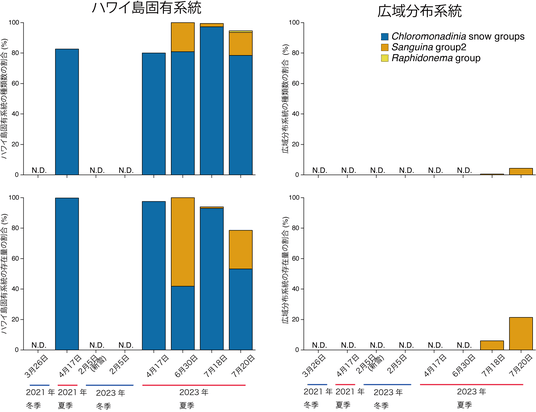 一方、遺伝子解析の結果、マウナケア山の赤雪から検出された雪氷藻類の遺伝子型の約95%(313/328)がハワイ島固有の系統という、群集の際立った固有性が示されました。また、その遺伝子型は、主として二つのグループに分類されました。一つは「クロロモナディニア(Chloromonadinia)」と呼ばれるグループで、群集の主要な構成群であり、複数のハワイ島固有の系統を含んでいました。もう一つは世界各地に広く分布する「サングイナ属(Sanguina)」の広域分布型で、ハワイ島では季節の後半、雪が長く残る局面で顕著に増加する傾向が見られました。季節の進行に伴い両者の相対的な割合が変わり、6月にはクロロモナディニアのハワイ島固有系統が優勢だった地点でも、7月には世界に普遍的に分布するサングイナ属の比率が上昇するなどの変化が確認されました。