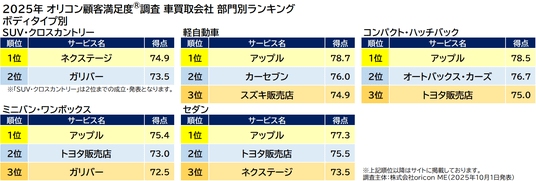 ~2012年の同ランキング発表開始以来、最多タイの総合1位獲得数に~ メーカー系では【トヨタ販売店】が最も高い評価に <初発表>ボディタイプ別ランキングで【アップル】が「軽自動車」部門など4部門で1位