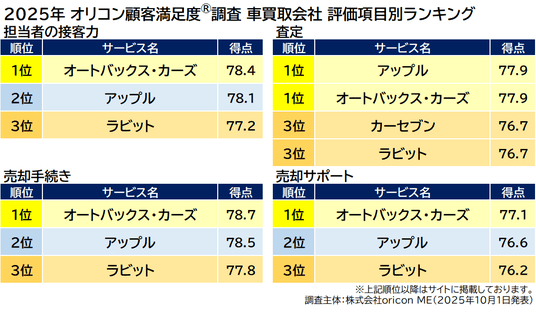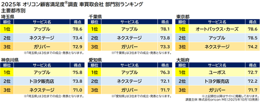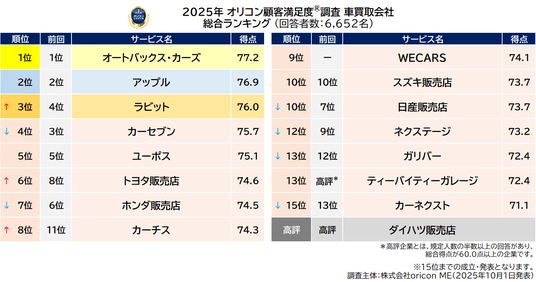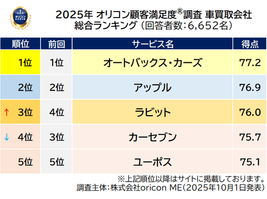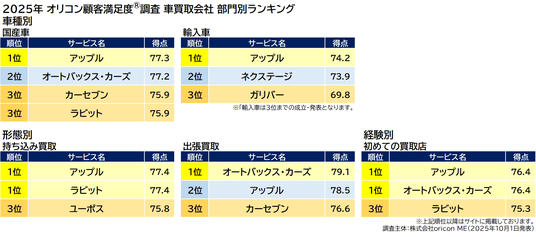 オリコン株式会社(本社:東京都港区 代表取締役社長:小池 恒、略称:オリコン)は、グループ会社である株式会社oricon MEが、実際のサービス利用者を対象に第三者の立場で実施した『車買取会社』についての満足度調査を実施し、2025年10月1日(水)14時にその結果を「オリコン顧客満足度(R)」公式サイト内( https://life.oricon.co.jp/ )にて発表いたしました。ランキングの結果は以下の通りとなりました。