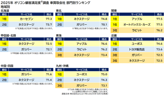 地域別ランキング【アップル】が「東海」で、【ユーポス】が「近畿」でともに3年連続1位に