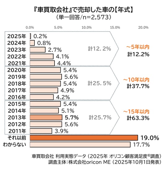 まずは『売却した車の【年式】(単一回答)』について聴取したところ、「2011年以前(それ以前)」が19.0%で最多に。次いで「2013年」が5.7%、「2012年」「2019年」がともに5.6%と続きました。