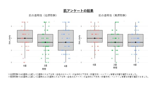 との回答が有意に増加しました。また、高摂取グループでは2週間・4週間の摂取にて肌の透明性が改善されたとの回答が有意に増加しました。