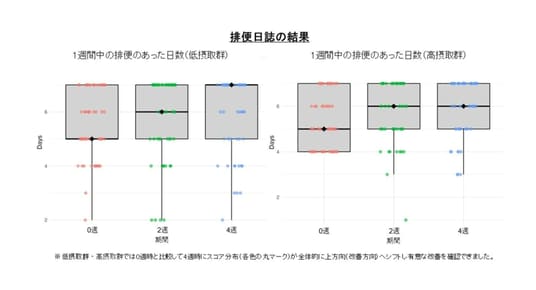 食物繊維の低摂取および高摂取グループでは2週間の摂取でJPAC-QOLスコアが有意に改善しました。また、排便のあった日数については、低摂取および高摂取グループともに4週間の摂取で有意に改善しました。
