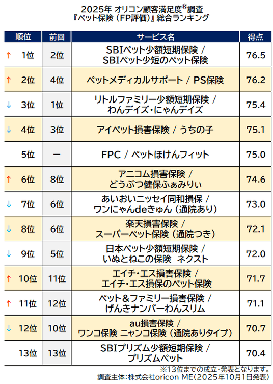 オリコン株式会社(本社︓東京都港区 代表取締役社長︓小池 恒、略称︓オリコン)は、グループ会社である株式会社oricon MEが、FP(ファイナンシャルプランナー)に聴取した『ペット保険』『ペット保険 小型犬』『ペット保険 猫』ランキングの結果を、2025年10月1日(水)14時に発表いたしました。結果は、下記の通りとなりました。