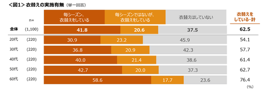 衣替えをしている人は62.5%で、「毎シーズン、衣替えをしている」人は41.8%。