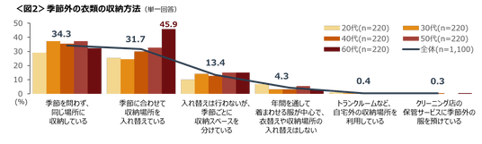20代~50代では「季節を問わず、同じ場所に収納している」 が、60代は「季節に合わせて収納場所を入れ替えている」がトップ。<図2>