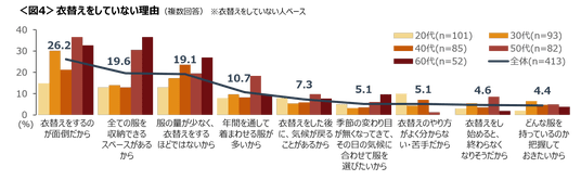 衣替えをしていない理由は、「衣替えをするのが面倒だから」「全ての服を収納できるスペースがあるから」「服の量が少なく、衣替えをするほどではないから」といった、衣替えの面倒さ、必要性を感じていないことが上位にあがった。