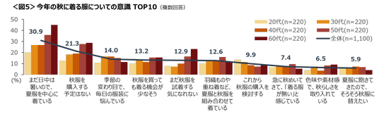 50~60代は、「まだ日中は暑いので夏服を中心に着ている」「秋服を購入する予定はない」「まだ秋服を試着する気になれない」と、暑さから秋服の着用・購入に後ろ向き。一方で、若年層ほど「これから秋服の購入を検討する」が高い。 <図5>
