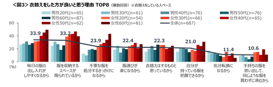 「毎日の服の出し入れがしやすくなるから」「不要な服を処分するきっかけになるから」「自分が持っている服を把握できるから」は、女性40~60代で高い傾向。<図3>