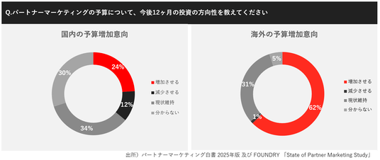 海外調査(※1)と比較すると、その差は一層際立ちます。海外でも「パートナーマーケティングに価値がある」との回答は68%とほぼ同水準ですが、予算増額意向は62%に達しており、日本との差が顕著です。