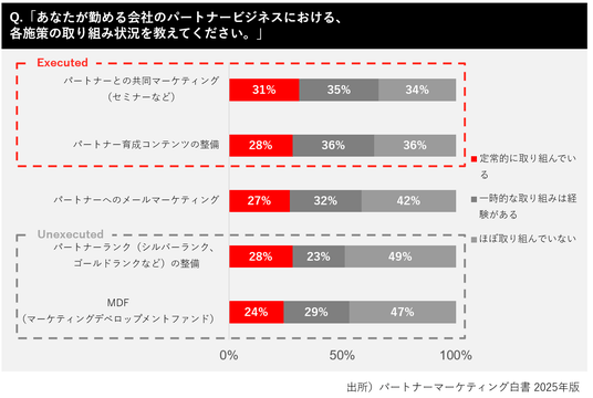 「パートナーとの共同マーケティング」や「パートナーの育成コンテンツの整備」は、約6割の企業が一度は実施した経験があると回答しました。これらはいずれも比較的コストを抑えて実行できる活動であり、前段で触れた「予算拡大に慎重な姿勢」と合致する結果と言えます。一方、パートナープログラムの構築といった、本格的な仕組みづくりに取り組んだことがない企業が多数を占めています。これは費用やリソースがかかる施策であるため、日本企業の多くは依然として「小さく試す」段階にとどまっている実態が浮かび上がります。