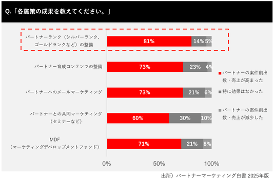 一方で、各施策の実施経験がある企業にそれぞれの成果実感を尋ねたところ、パートナーランク整備における成果実感は80%以上と、全施策の中で最も高い結果となりました。共同マーケティングやコンテンツ整備といった比較的軽量な取り組みよりも、体系的なプログラム設計に踏み込んだ企業ほど、成果を強く実感している傾向が見られます。