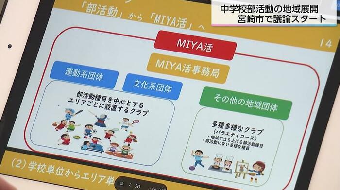 宮崎市は協議会で、2026年秋から平日は従来通り中学校で部活動を行い、休日は市が運営主体となる認定地域クラブで部活動を行うことを検討している。