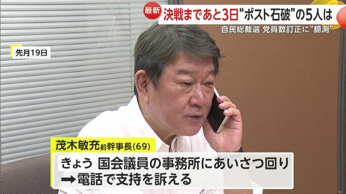 また、茂木敏充前幹事長は国会議員の事務所に挨拶回りをした他、電話で支持を訴えた。