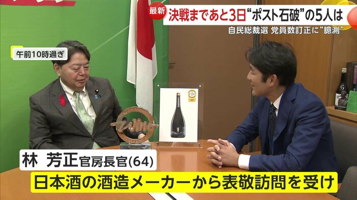 林芳正官房長官は、世界の大会で最優秀賞に選ばれた日本酒の酒造メーカーから表敬訪問を受け自らの実績をアピールした。