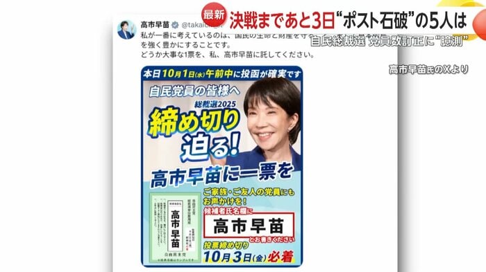 その高市早苗前経済安保相は1日「どうか大事な1票を、私、高市早苗に託してください」とSNSで党員に呼びかけた。