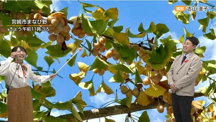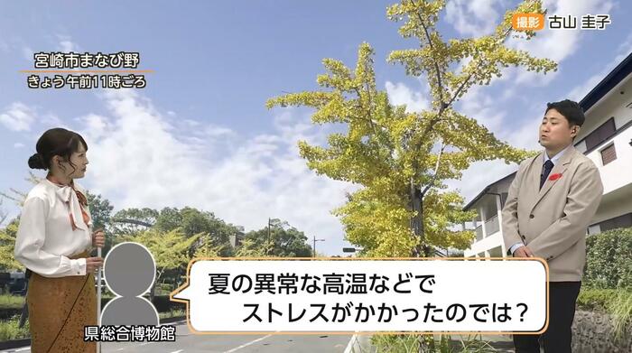 まずは古山予報士が見つけた「小さい秋」の映像。街路樹の「いちょうの木」が色づいている。ただ通常、日本でいちょうが色づくのは、大体11月に入ってから。なぜこんなに異常なほど早く色づいたのか、原因を県総合博物館の方に聞いたところ、「夏の異常な高温などでストレスがかかり、早く子孫を残そうと黄葉させて実をつけたのではないか」ということだったという。