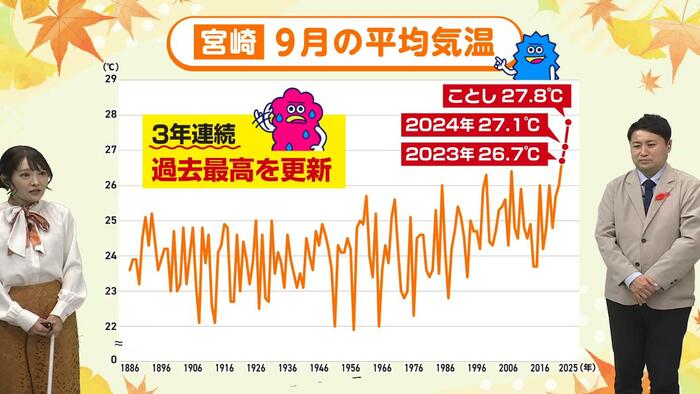1886年の統計開始以降の9月の平均気温を見てみる。ここ数年で一気に上がっていることが分かる。2023年に26.7℃、2024年に27.1℃、そして2025年はなんと27.8℃と、3年連続で過去最高を更新している。